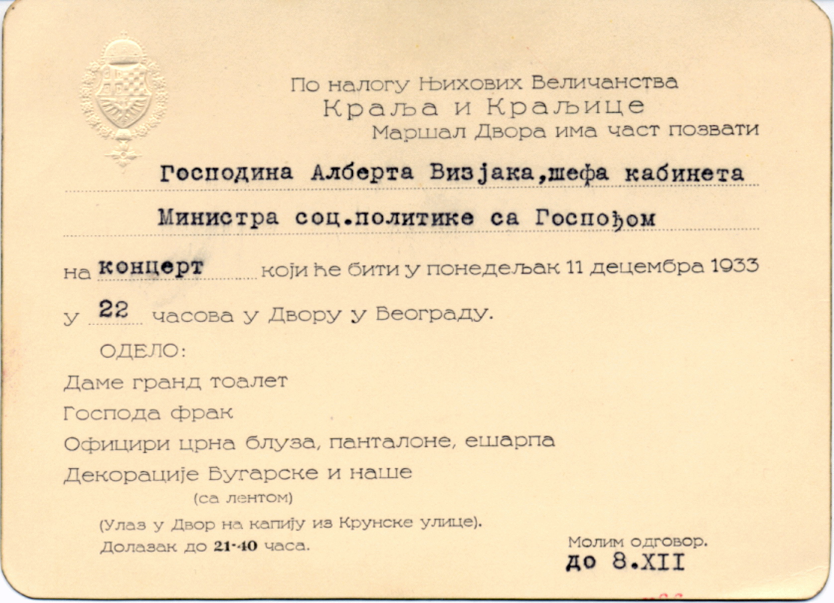 Poziv na Dvor za Alberta i Paulu Vizjak, 1933.