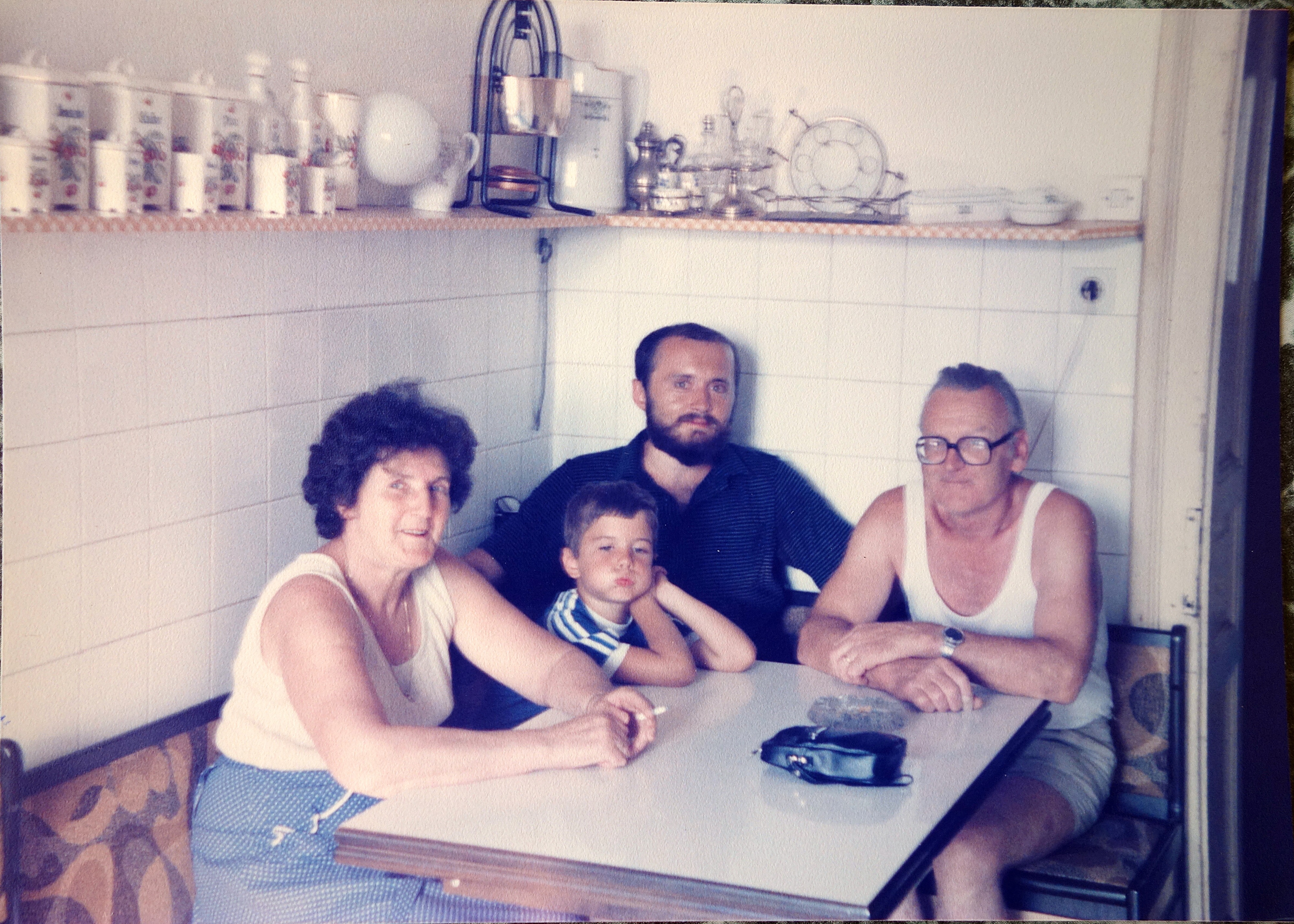 Fajgelji u kuhinji u Skenderiji 36 u Sarajevu (nema Ivančeka, prepostavljam da on slika). Zapravo, Saša je na prozoru. Iza None se vidi kredenac (iz njega je Nani jugo sakuk doj), a u visini snimatelja su veliki šporet i lavabo.