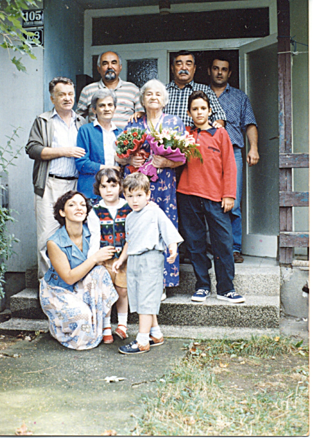 Rođendan tetke Radojke. Iza nje stoje sinovi Boban i Mile, pored nje praunuk Ognjen, a ispred nje čuči unuka Snežana i njen sin Aljoša (Radojkin praunuk).