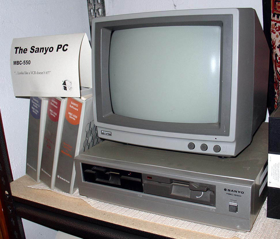 Sanyo MBC-550. Moj prvi PC. Kupljen u Minhenu 1984. Na slici je kolor monitor, ja sam imao crno bijeli. Neopisivo iskustvo. Reklamirao se kao isti kao IBM PC (koji se nešto prije toga pojavio), za mnogo manje para. Međutim, nije se još razjasnio princip kompatibilnosti, pa on nije bio 'isti', nego vrlo sličan.