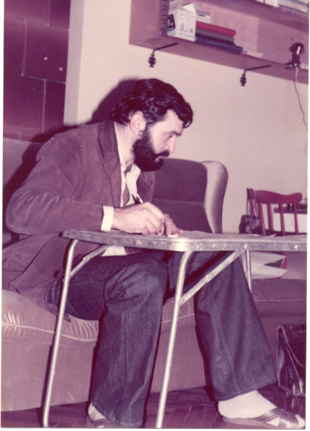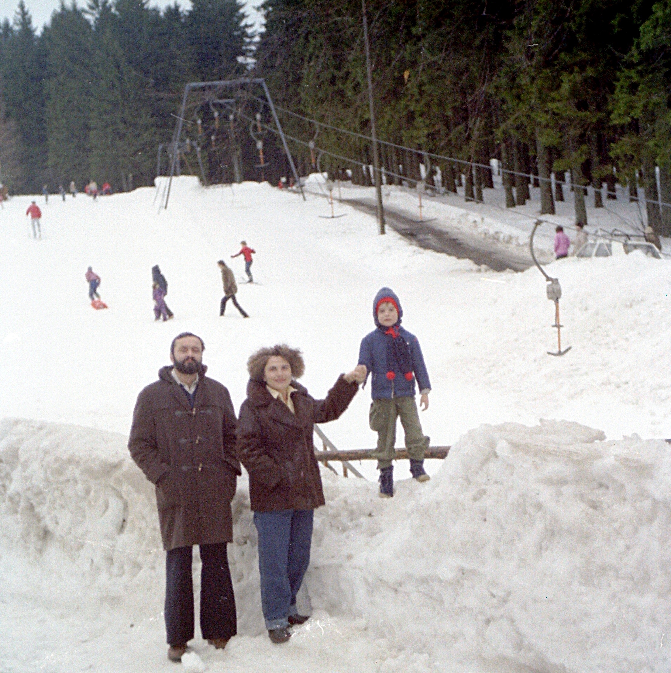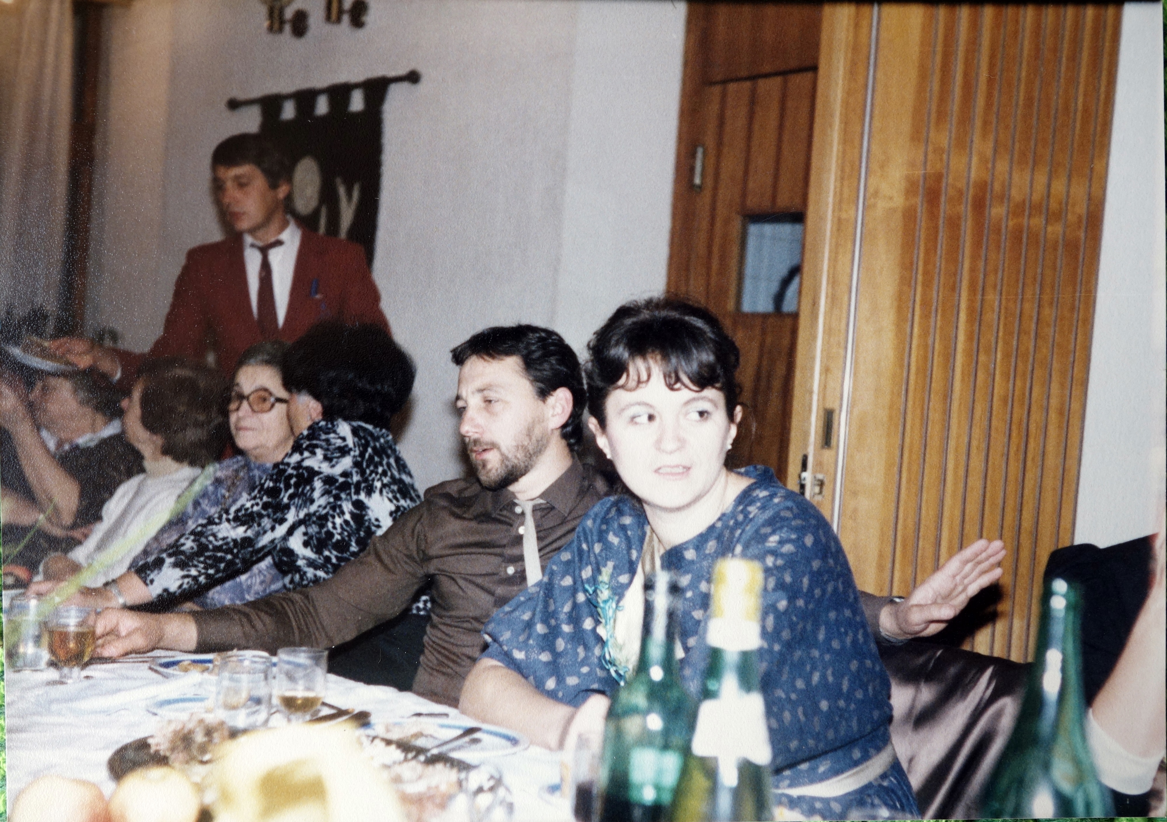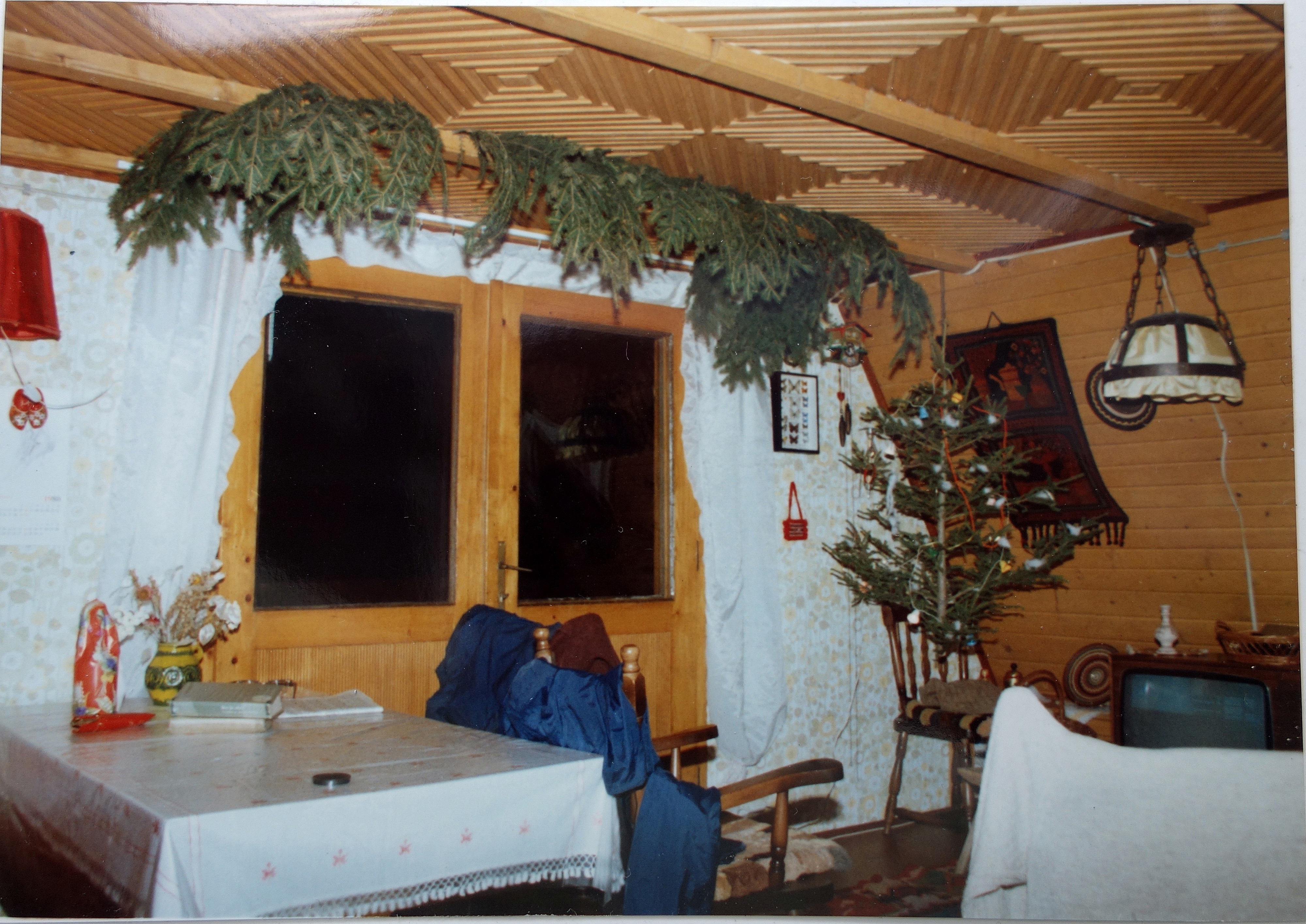 Glavna soba u vikendici u Trnovu, doček nove godine 1980/81. Kasnije su ovaj sto i stolice prebačeni umjesto televizora i pored njega je stavljen frižider. Vide se lijepi, očuvani Borini leptiri. Strop je bio i ostao isti. Lokalni majstor Božo ga je zvao 'amitacija', što će reći imitacija nečega.