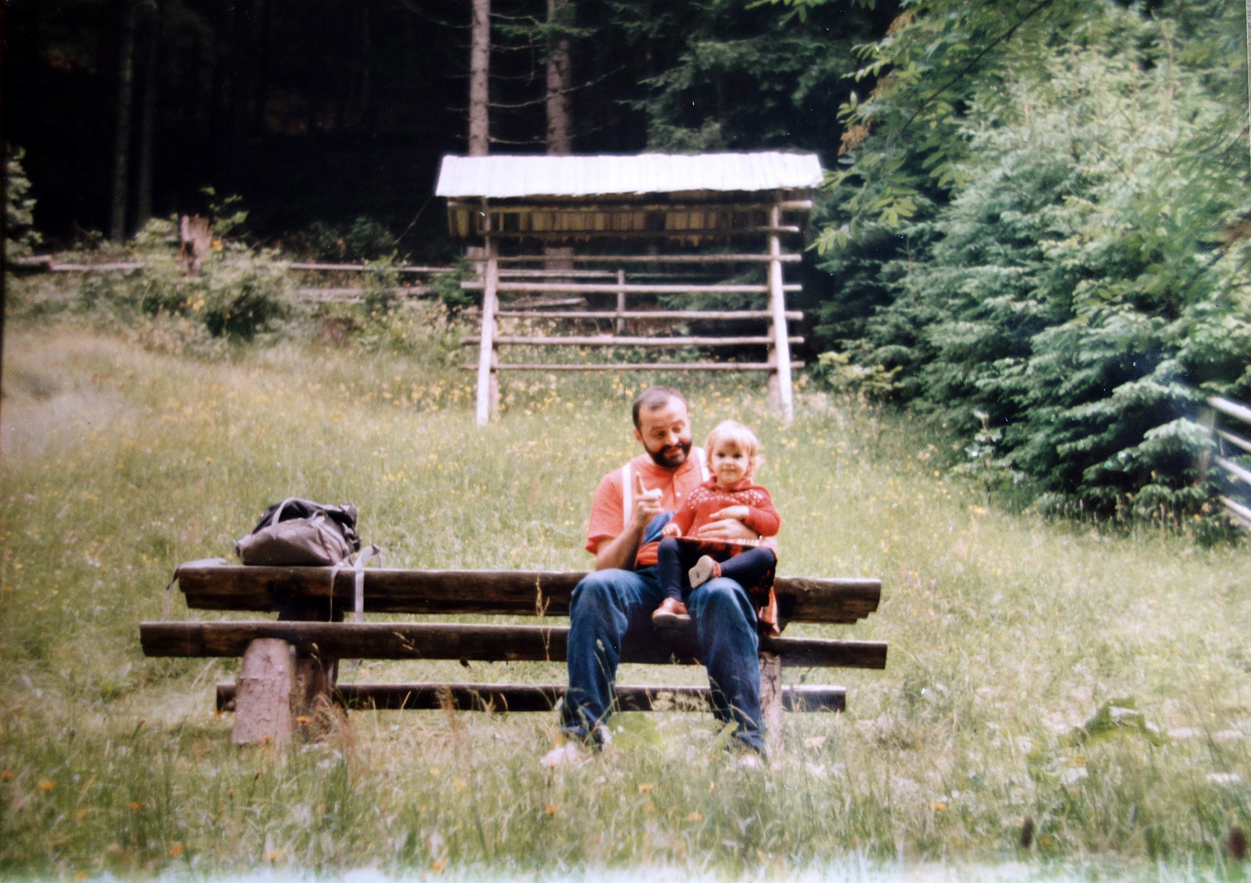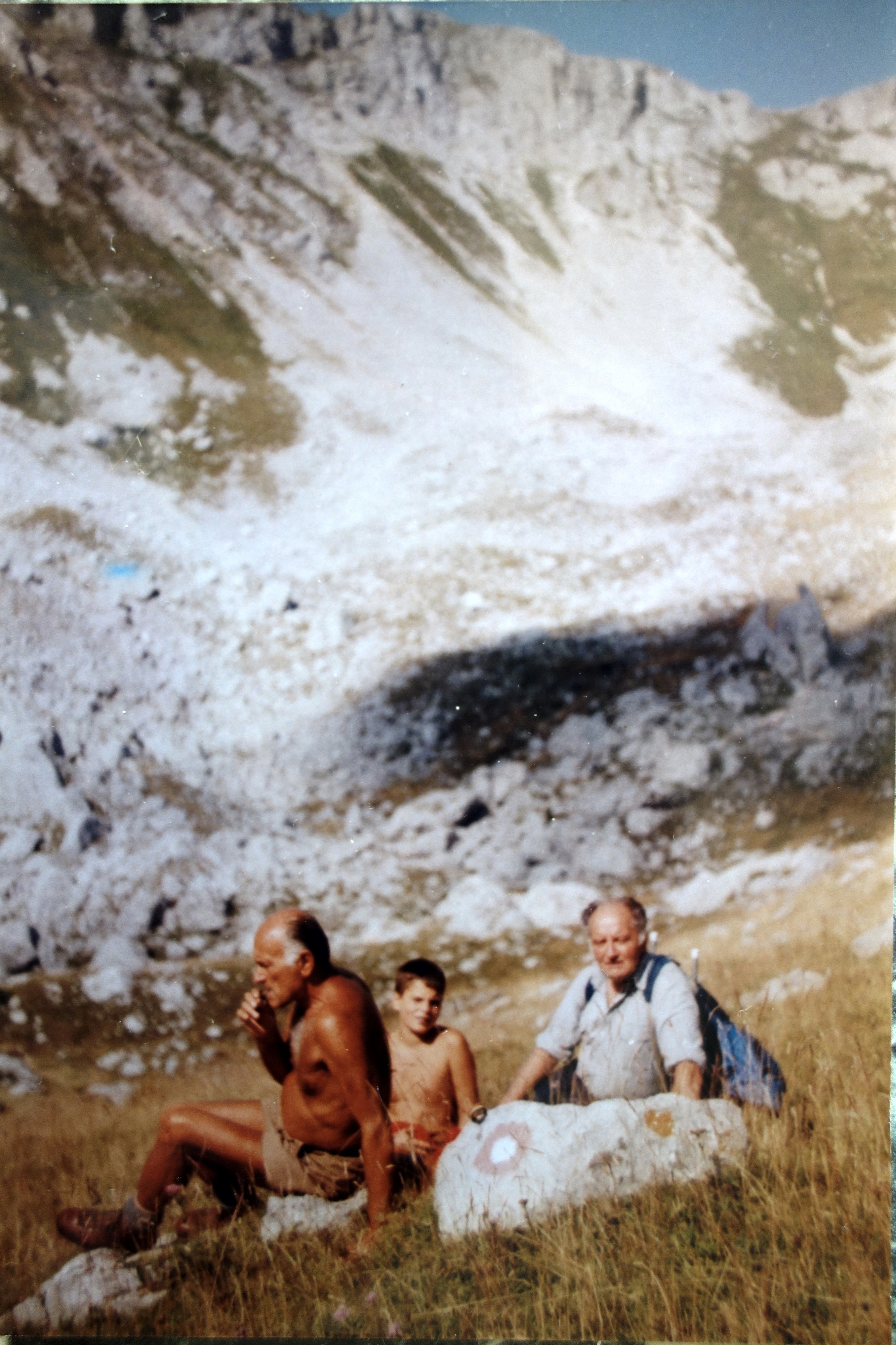 Ljetovanje na Bledu 1988. Izlet na Pokljuku i uspon na Viševnik (2050 nm). Iza mene je Triglav (2863). Nisam ispunio zavjet da se svaki Slovenac popne bar jednom na Triglav, ali sam bio blizu. Sa mnom su Olivera i Andrej, a Katarinu sam nosio na glavi, zaspalu. Tad sam imao neiscrpnu kondiciju.