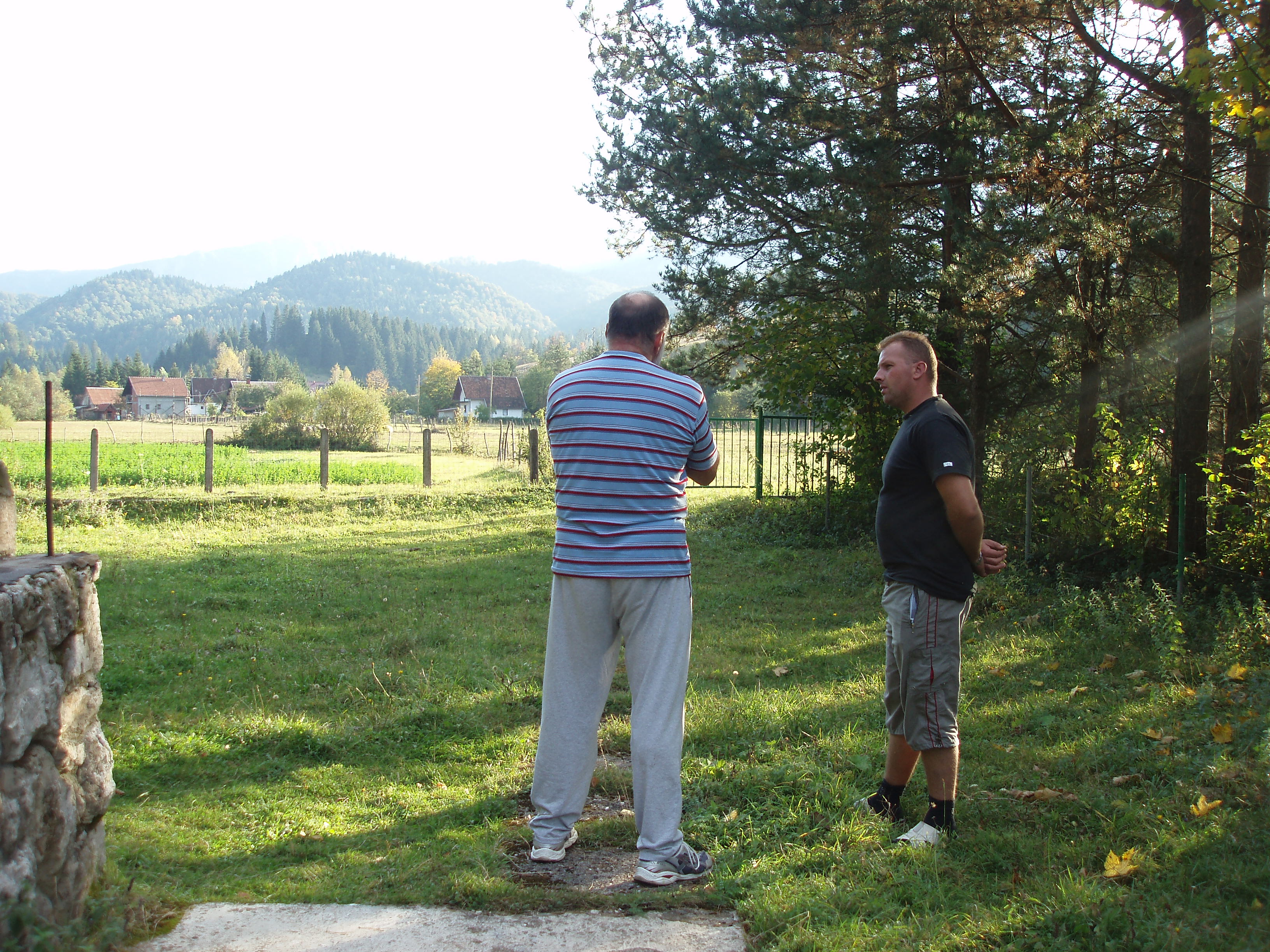 Sa Dževadom Ozdićem (Seidovim unukom iz Turova) pored ostataka vikendice, 2009. Naprijed se vidi ograda sa betonskim stubovima, na malom nasipu. Tata je digao nasip protiv proljetnih voda, lio stubove i razvukao žicu. Onda idu željezna vrata, koja su nekako preživjela rat. Desno se vidi moj uradak, jadni mali željezni stubići koje je Dževad postavio kao kakvu takvu ogradu prema komšiji Džemi. Komšija je zasadio te brzorastuće borove i potpuno nam ukrao sunce. No, to je sada sve ad acta.