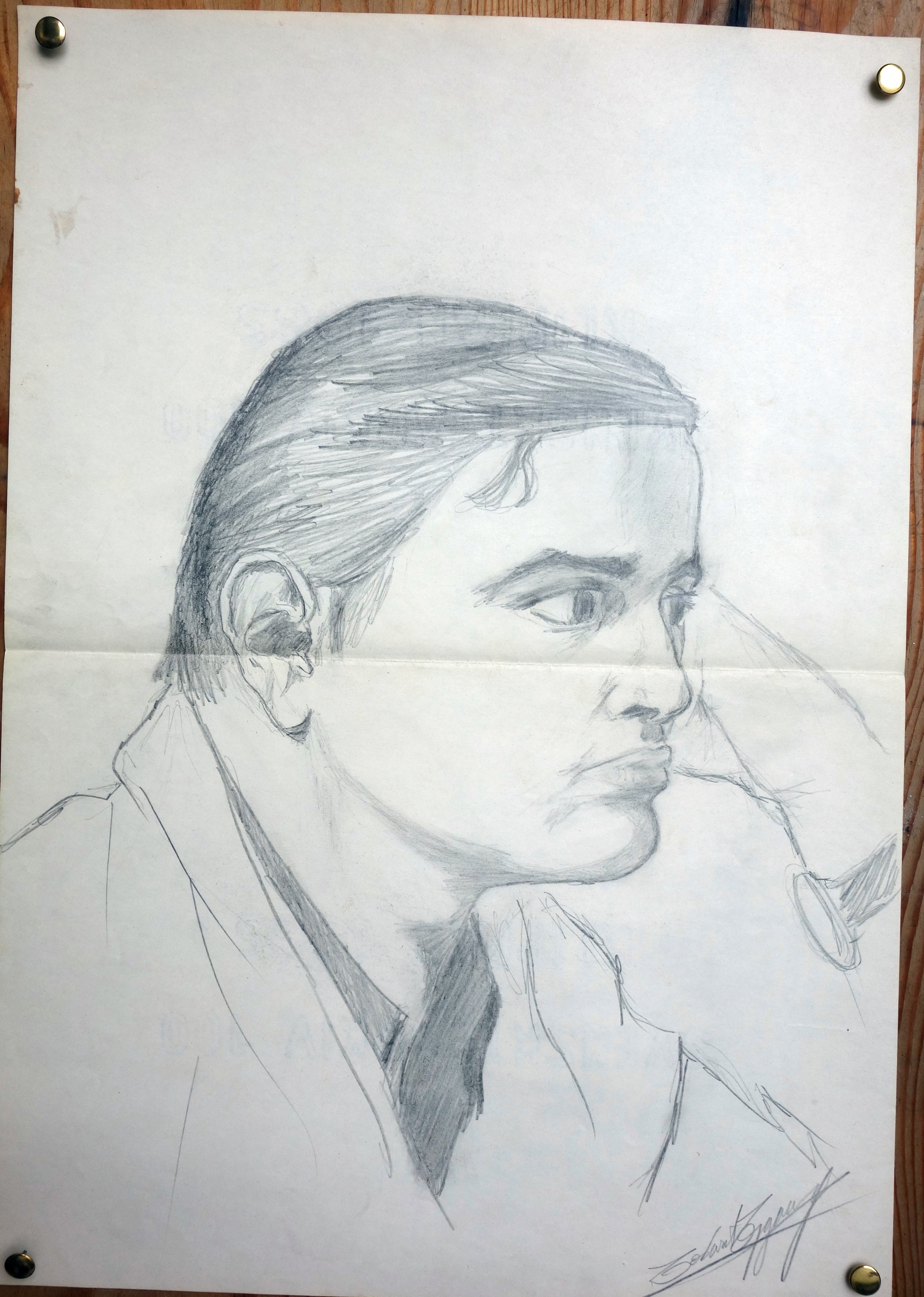 Moj portret u olovci. Budimir Bobičić. Vidi se i jedan od mojih ručnih satova, koje sam nosio decenijama. šteta što je list Klippan papira presavijen. Klippan mi je donio tata iz švedske za tehničko crtanje na mašinstvu. Liči na pergament.