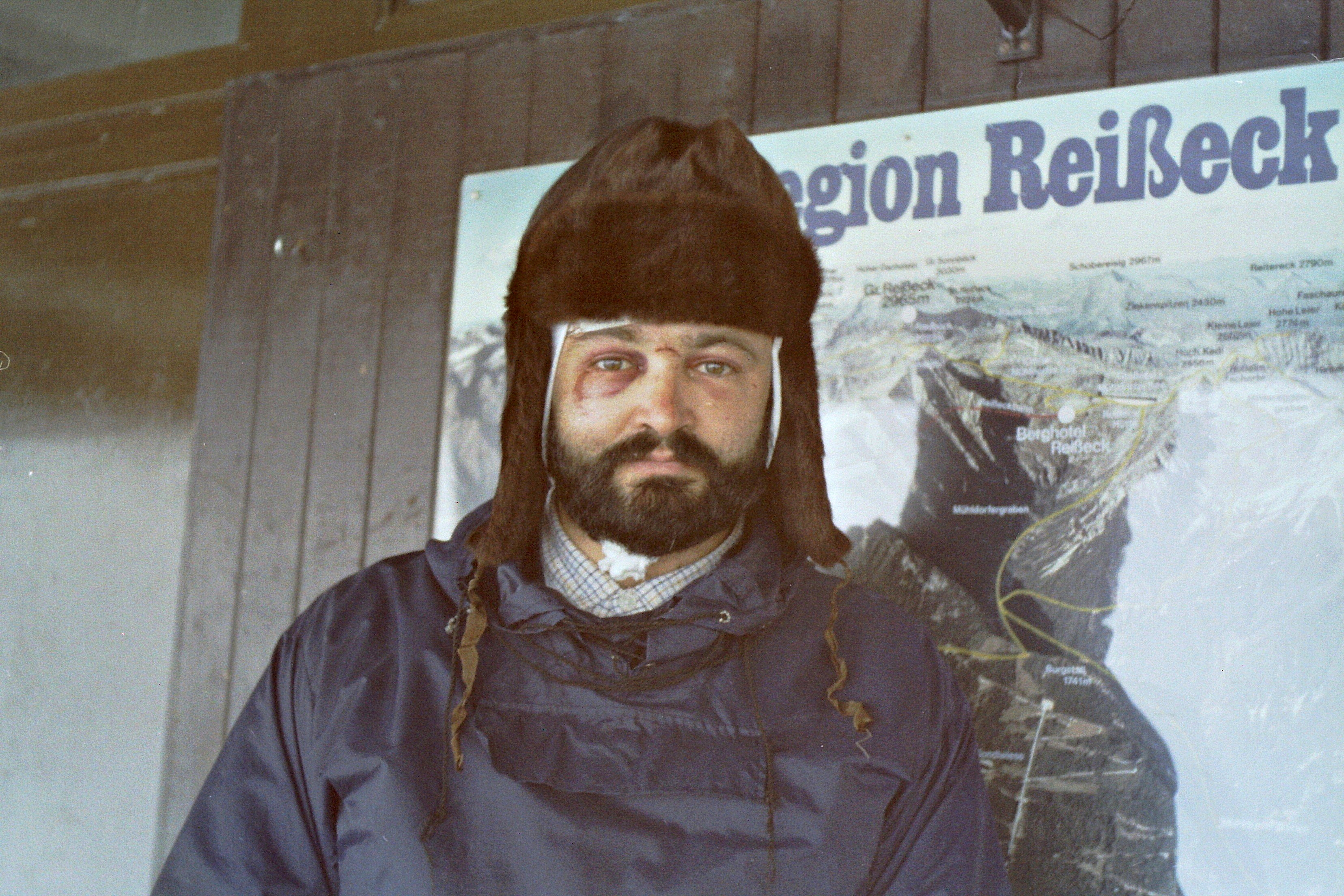 Zimovanje u Austriji, 1984?. Reisseck, 2245 mnm. Poslije pada na skijama, ušiven i u poštedi, lagano se šetam.