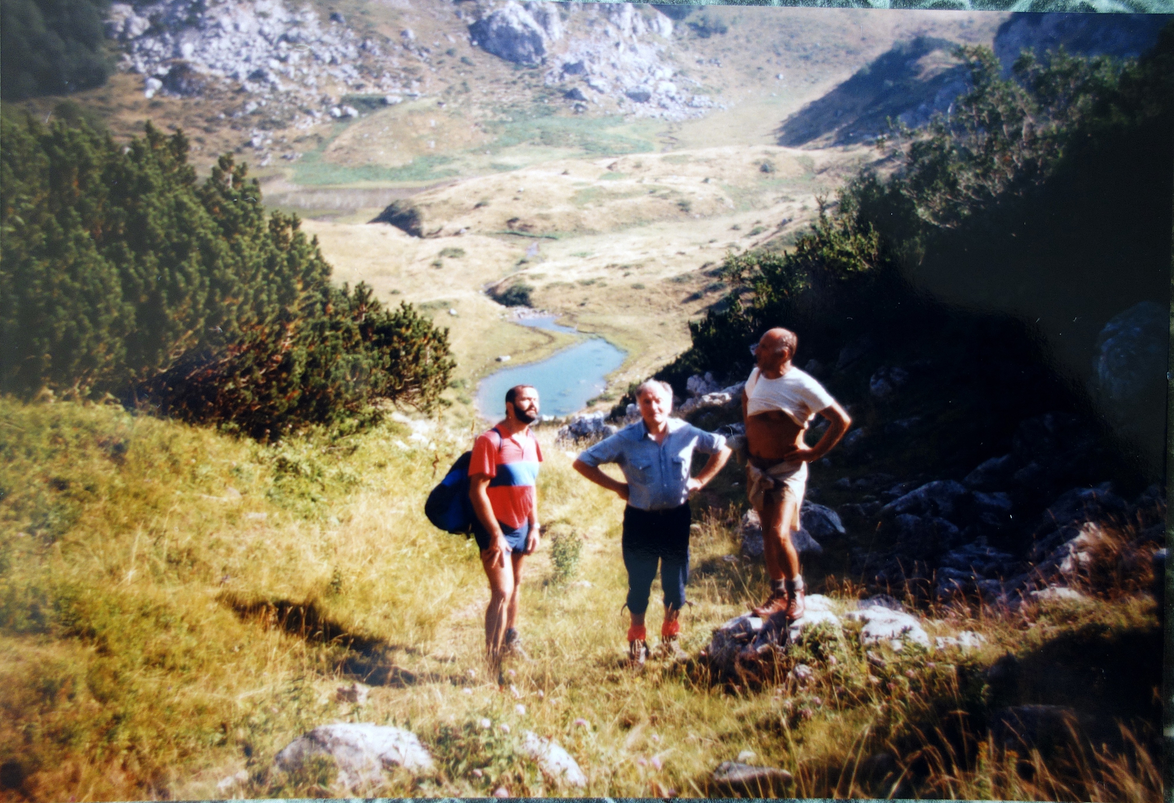 Stane, Saša i Duško iznad Velikog jezera, koje vijuga grebenom Treskavice. Ima i drugih jezera i navodno su tu od ledenog doba. Slika Andrej.