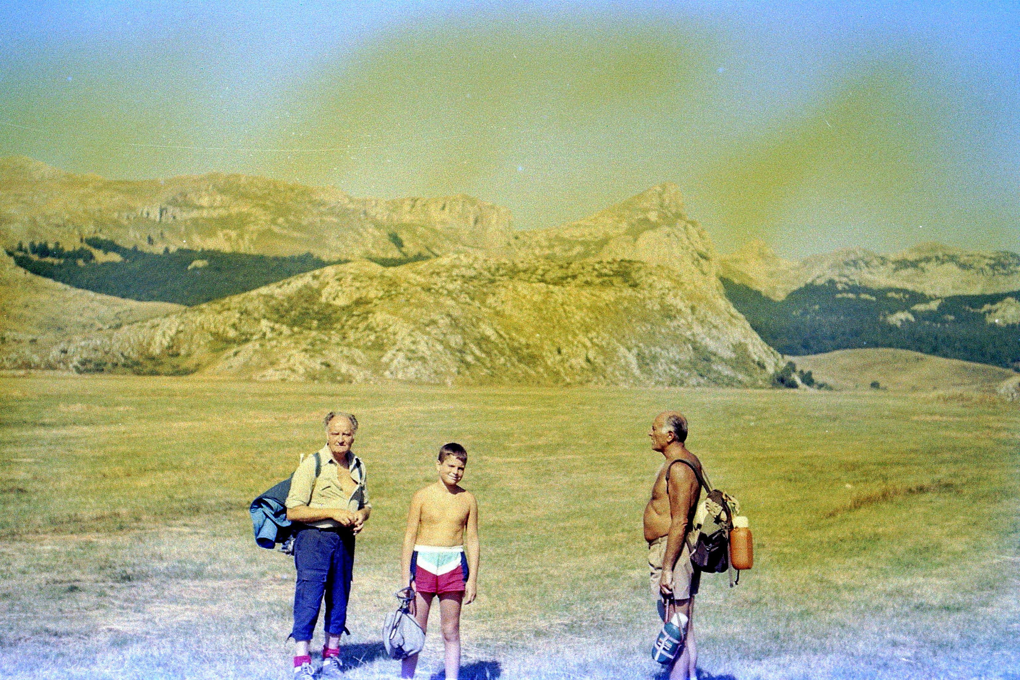 Uspon na Đokin toranj 1990. Saša, Andrej, Duško. Od vikendice ima otprilike 26 km. U pozadini se malo vidi masiv Treskavice. Ne shvatam gdje je ovo polje.