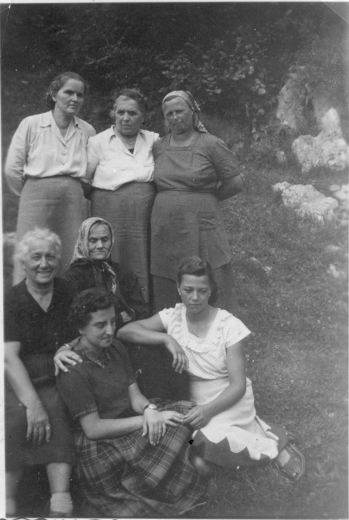 Trnovo pri Gorici. Stoji, u sredini, Marica Vidič. Sjedi, prva s lijeva, Avgusta. Ispred nje Nives.
