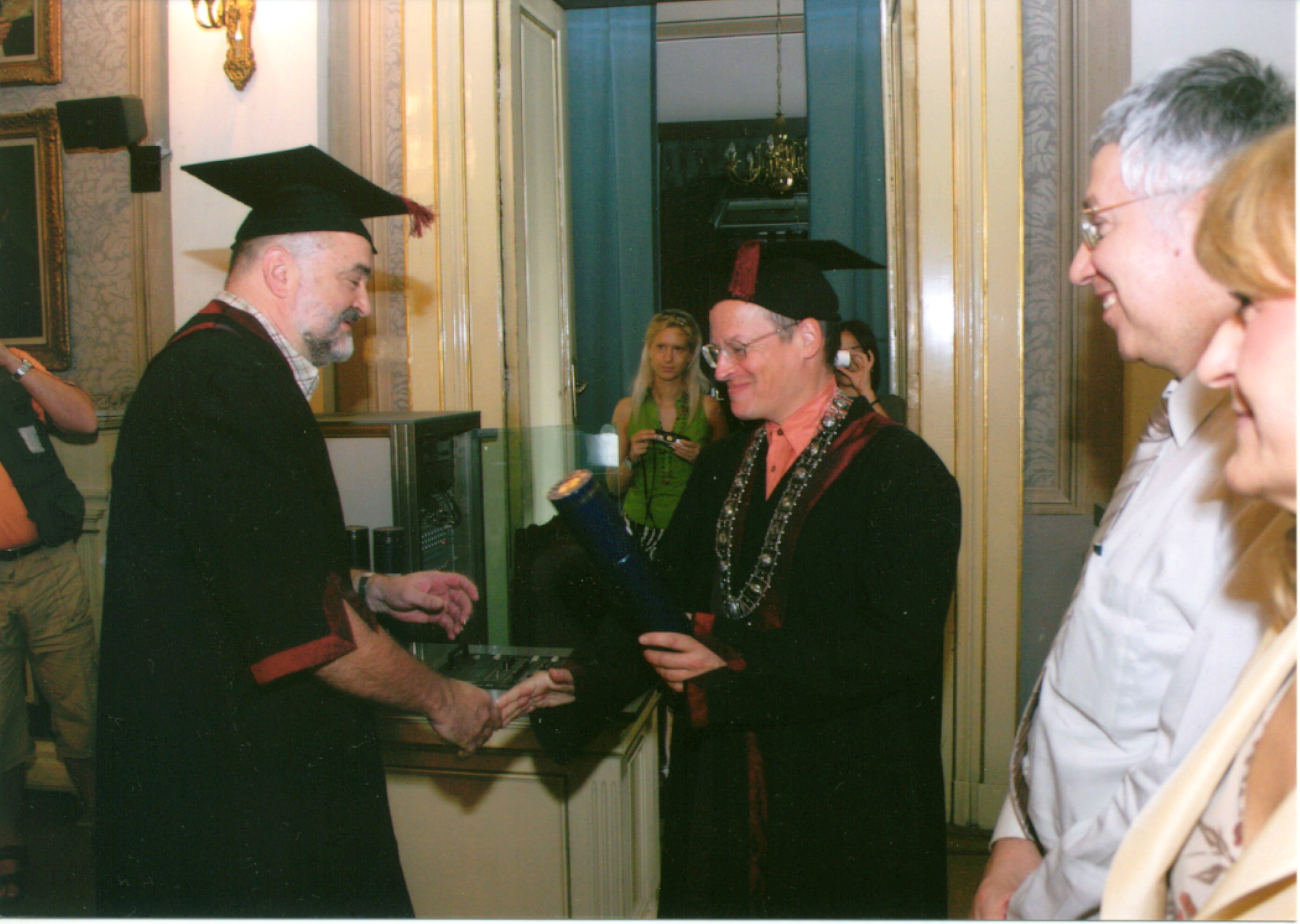 Prorektor Lipkovski mi uručuje dr diplomu. Desno stoji Dragan Popadić.