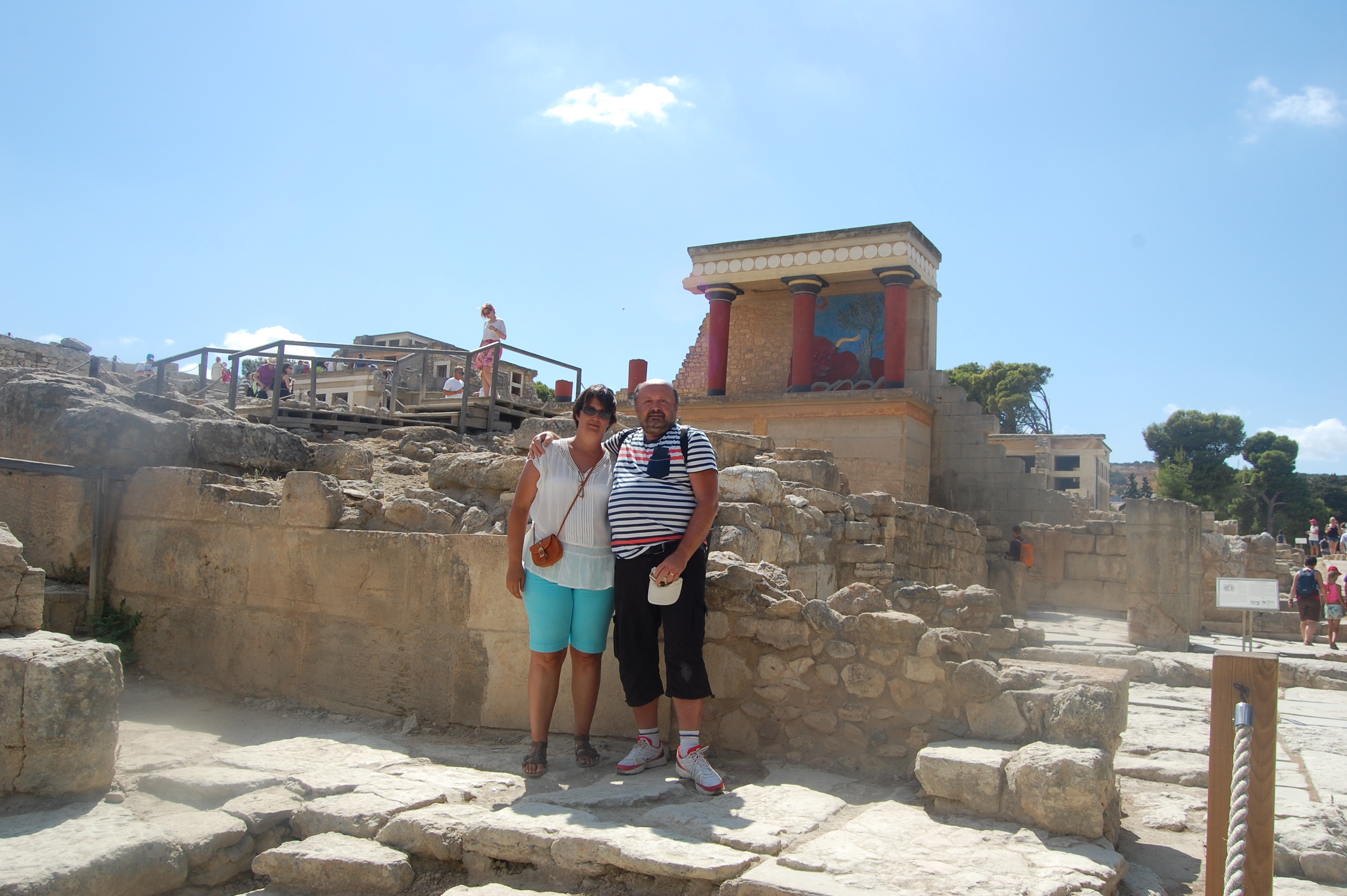 Rekonstruisani ostaci palate u Knososu, Krit, Minojska kultura, oko 2000. pne. U prednjem planu su Bilja i Vojko koji su 2014. ljetovali na Kritu.