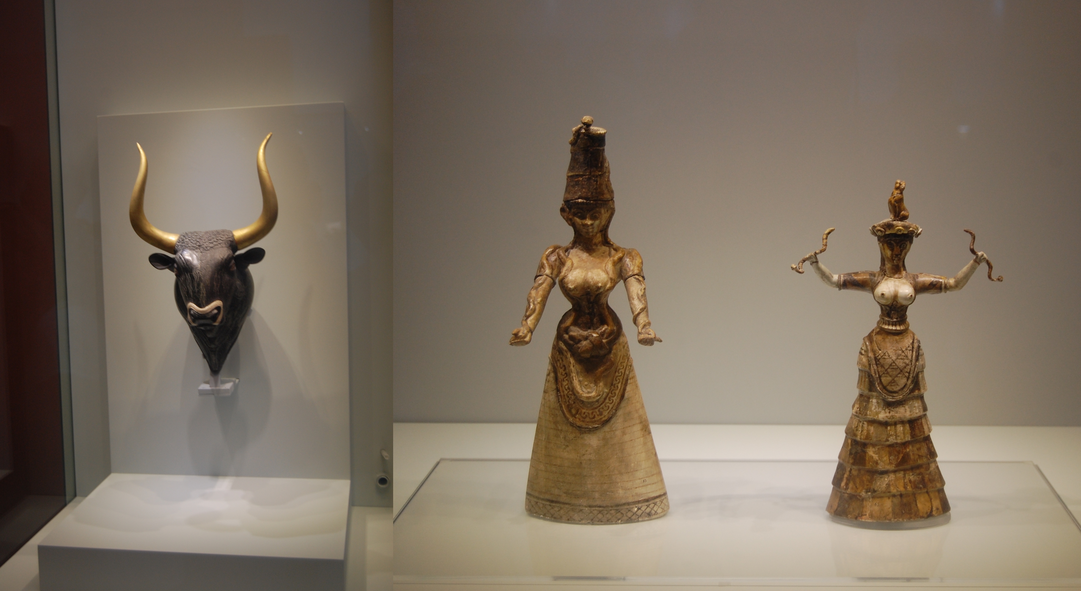 Vrč u obliku bika i Zmijske boginje, Minojska kultura, oko 1500 godina pne. Muzej u Heraklionu na Kritu. Snimio Vojko 2014.