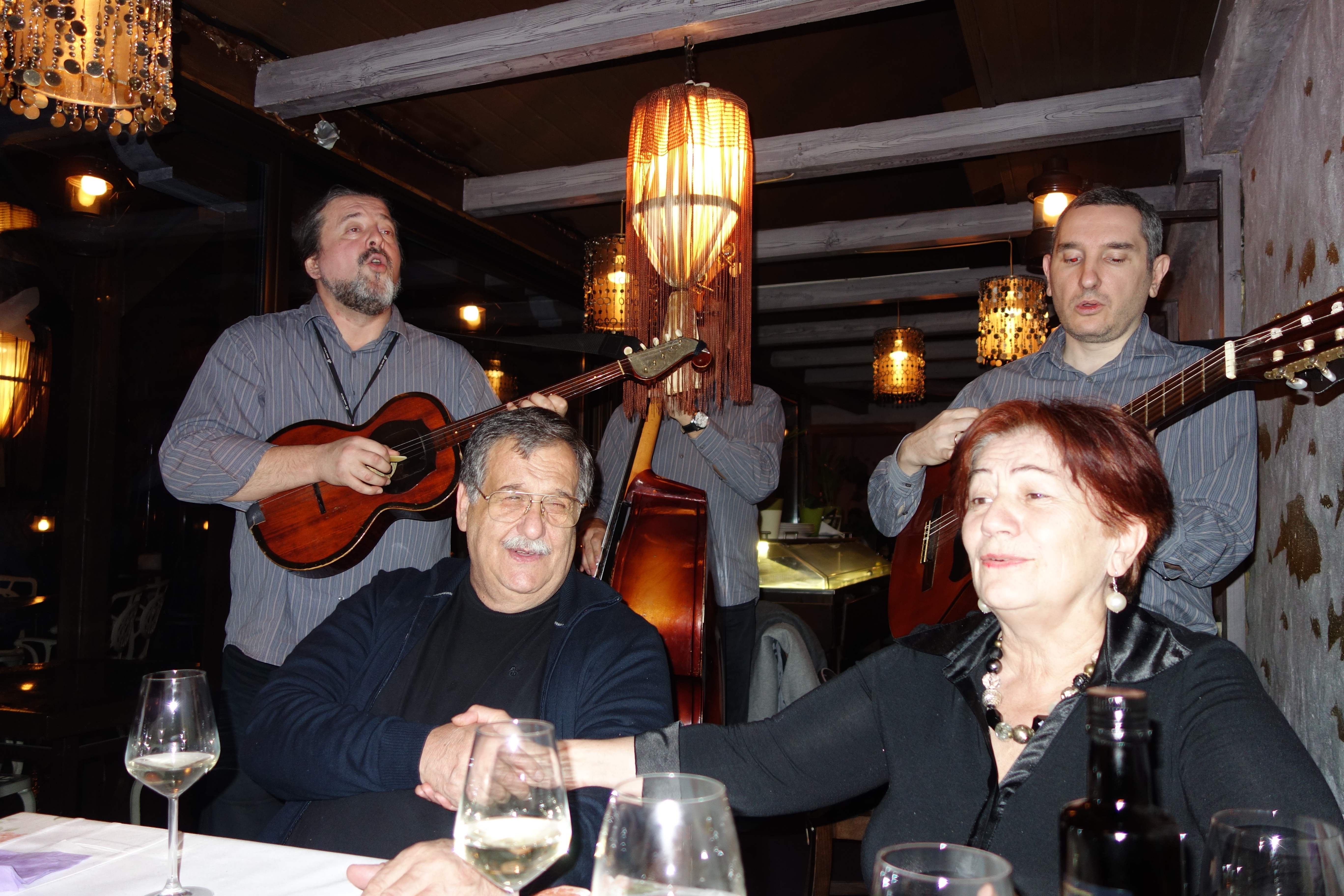 Ja i Smiljka Vujnović (sada Smilja Carter). Po meni, to je tokom njenog drugog dolaska u JU, sedamdesetih godina. Sudeći po pivu, možda u BG. Vidi se tadašnji način posluživanja hljeba. Nažalost, sve su stare Smiljkine slike lošeg kvaliteta.