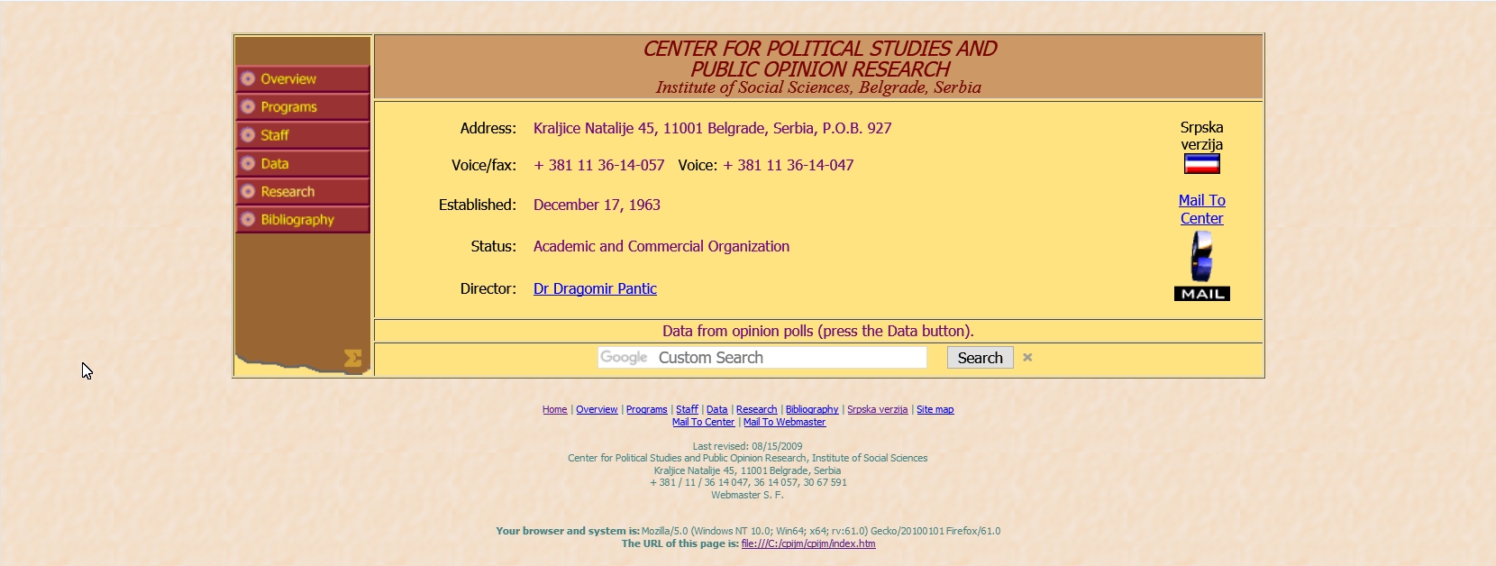 Uvodna stranica sajta CPIJM. Prva verzija je napravljena 1997. i kasnije stalno dorađivana, dopunjavana, ažurirana, proširivana... Zoran Slavujević je podatke sa tog sajta koristio u nastavi, a kasnije sam i ja otvorio svoje studentske stranice, krišom i sa strane. Tako da je sajt bio vrlo posjećen. Kada su Dragan i Ljilja otišli u penziju, Centar više nije plaćao hosting i sajt je izbrisan. Sajt je pravljen ručno, u HTML, sa nekoliko Java skriptova i uz malu pomoć nekih html alatki. Dugmad, pozadine i estetiku sam isto pravio ručno. Sajt je imao kompletnu srpsku i englesku granu, a rezultati sondaža su se redovno ažurirali, znači u hodu prevodili. Sve u svemu, za moje razmjere, bio je prilično živahan taj sajt: www.cpijm.org.yu (kasnije .rs).