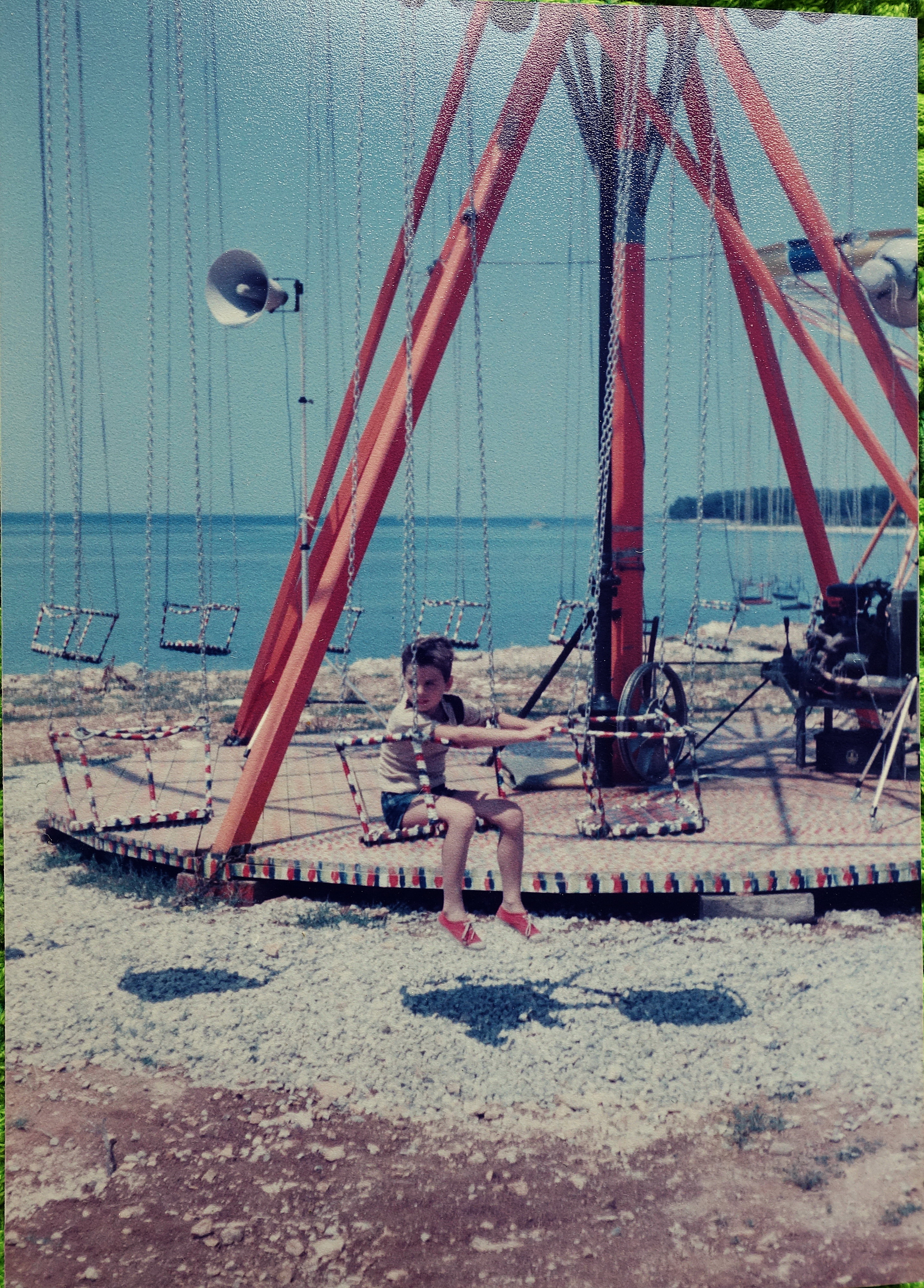 Andrej na ringišpilu. Ljetovanje u Vojnom odmaralištu Fažana, 1983. Taj zabavni park je bio blizu odmarališta i stalno se čula muzika i najave voditelja sa čudnim naglaskom 'avionska vožnja'. To se odnosilo na veliki ringišpil, a ovo je dječji. Film je u vrlo lošem stanju, ima neke pahuljice, a slike su izblijedile. Uopšte nisam zadovoljan kvalitetom kolor filmova i fotografija nakon par desetaka godina.