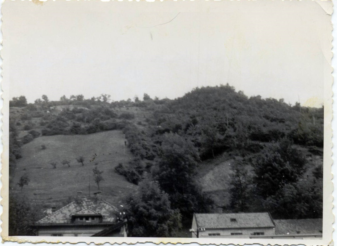 Gaj. Pogled iz kuhinje u Skenderiji 36. Ta livada je mene uvijek podsjećala na leđa. Iznad nje ide uskotračna pruga za Višegrad (desno se malo nazire nasip). Ispod livade ide put, desno ka Soukbunaru, a lijevo ka Čobaniji, ne znam više. Svaki žbun priča svoju priču.