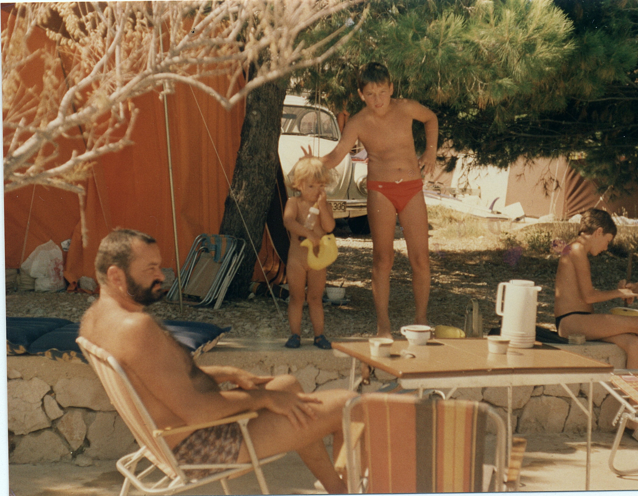 Ja, Nina, Andrej i Nemanja Ristivojević ispred šatora u Tijesnom, na Murteru, 1988. Ristivojevići su imali prikolicu.
