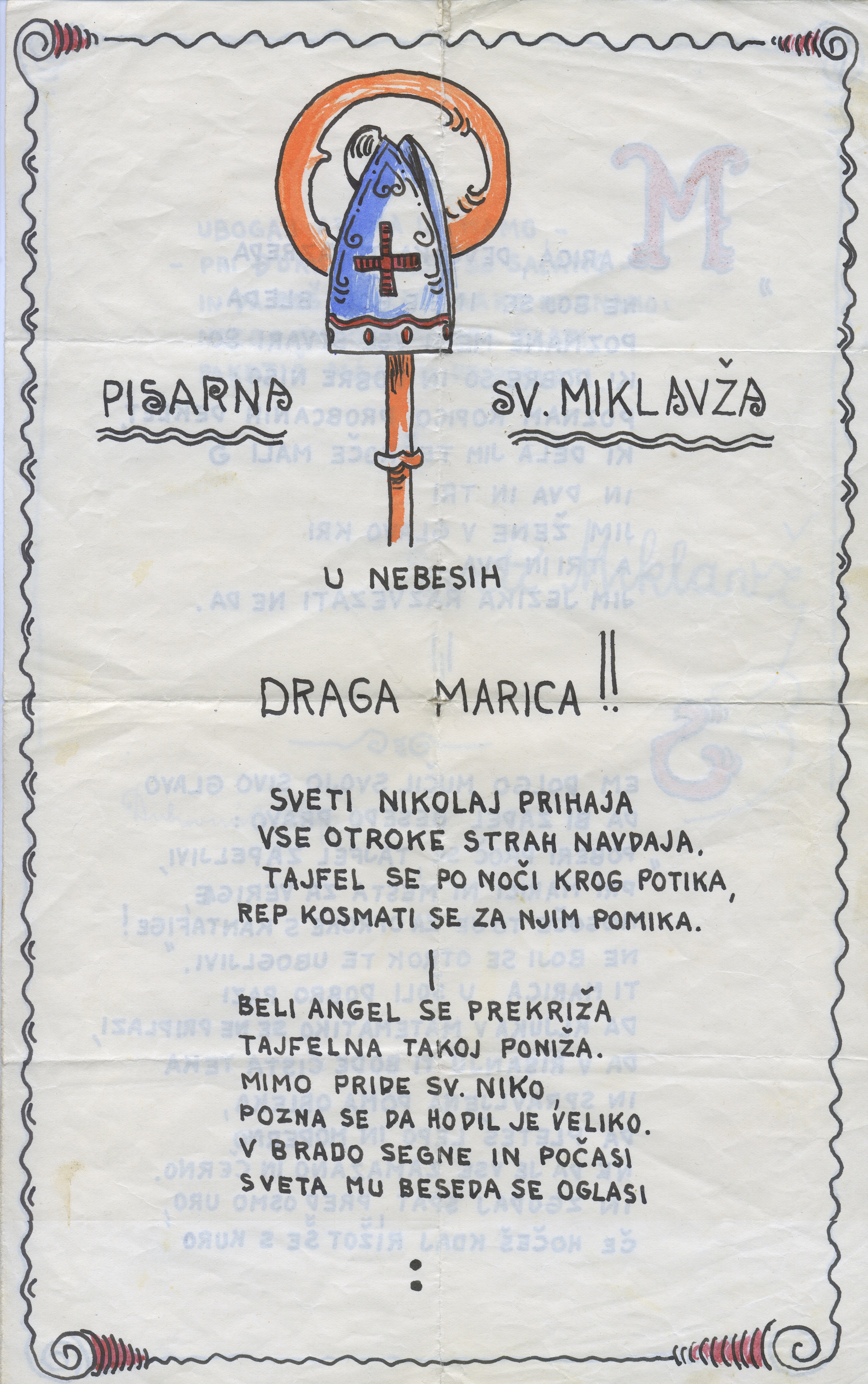 Ludvik piše, preko pisarne na nebesima, novorođenoj Marici povodom Sv. Miklavža (valjda Sveti Nikola).