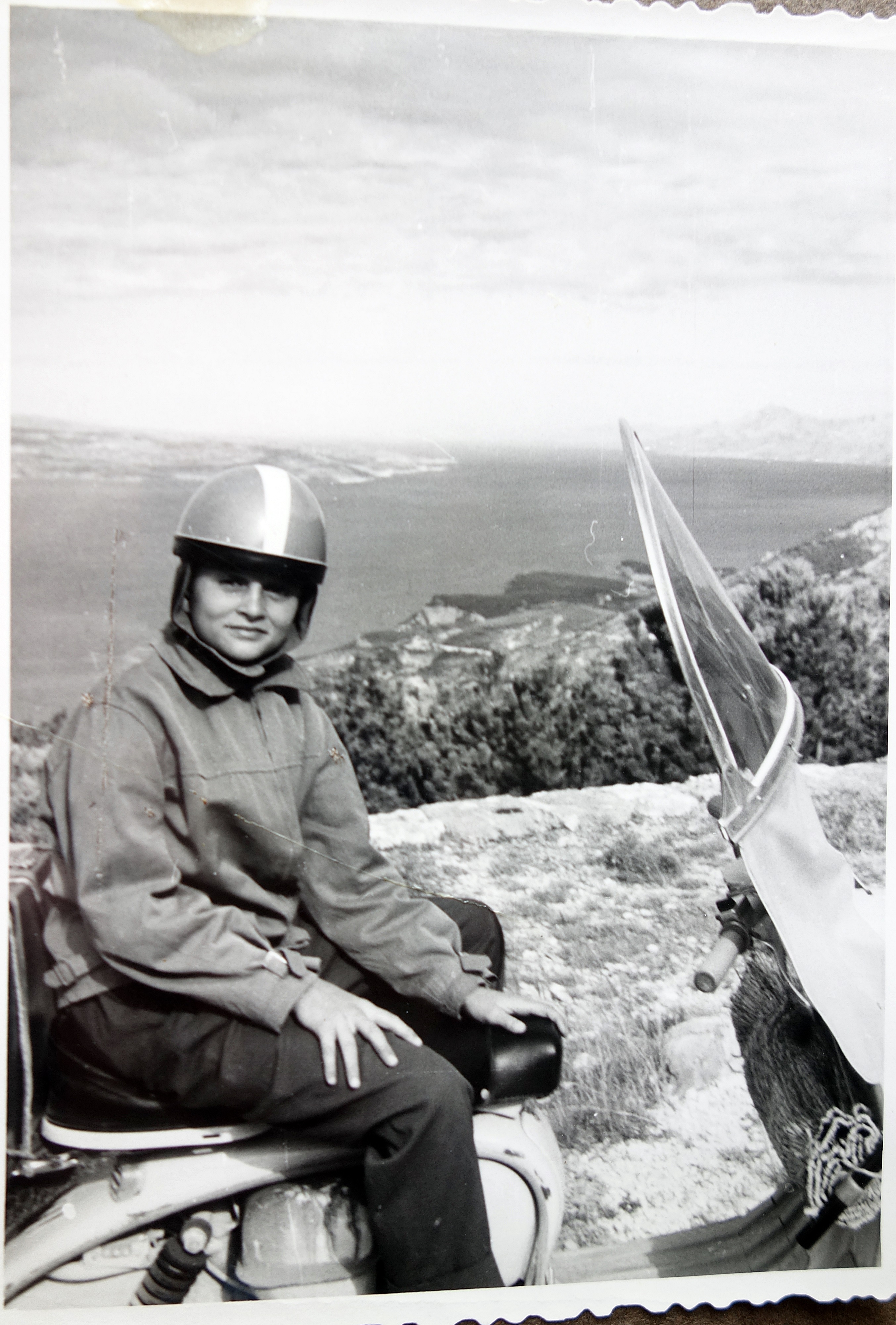 Na budućoj Jadranskoj magistrali. Tada je to bio uzak, krivudav i loš makadamski put. Negdje na Makarskom primorju. Ove 'čelade' smo kupili u Ljubljani, te ili prethodne godine, ne znam. Sa Lambrettom smo prošli zapadni dio JU. Bila je čak i na prevoju Vršič (1600 mnm). Ovdje se vidi da smo joj skinuli krila zbog hlađenja.