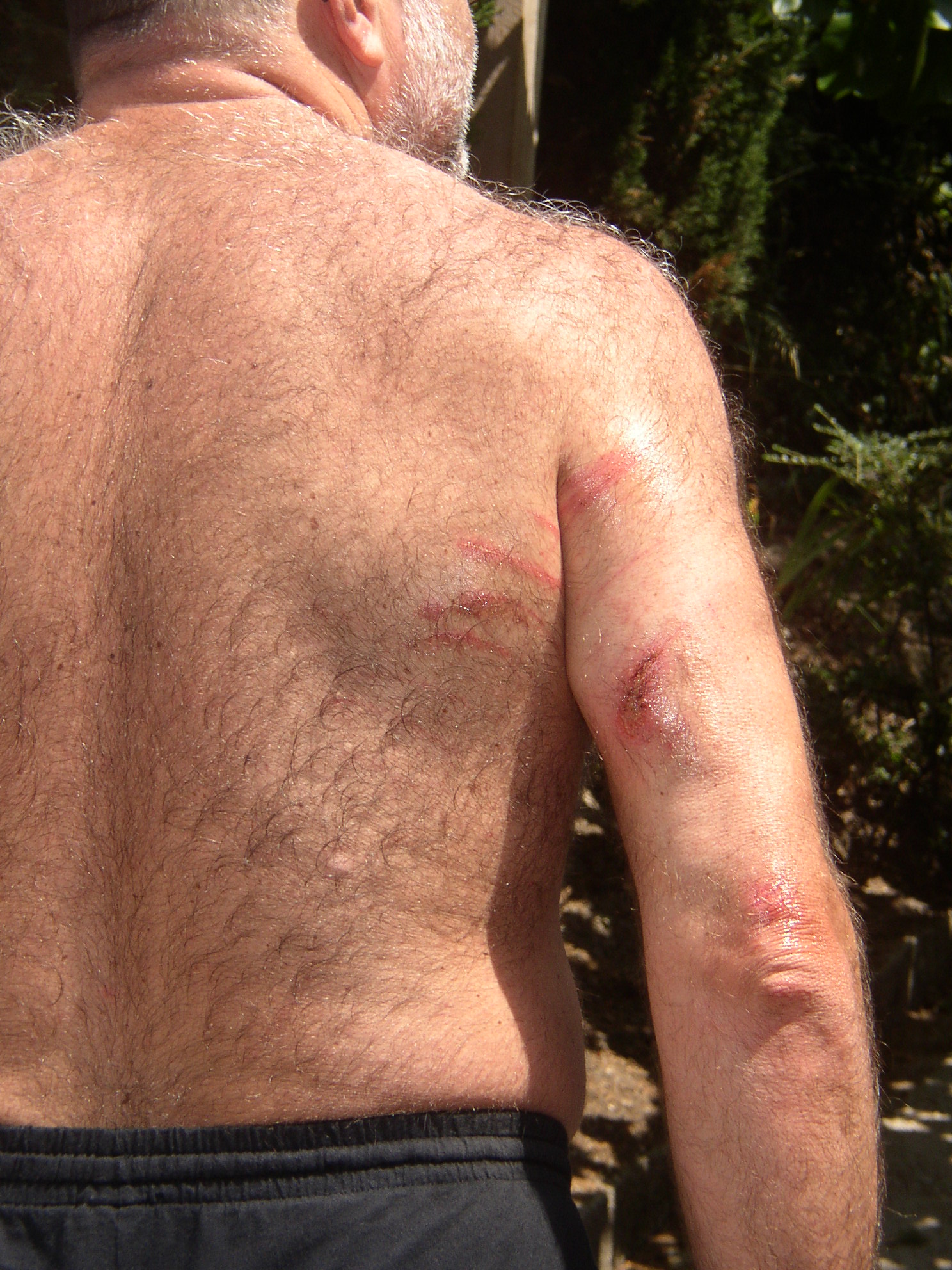 Hercegnovi, 2003. Pregazio me motorni čamac. Leđa su od elise, a ruka (i donji dijelovi) od struganja niz korito i kobilicu čamca.